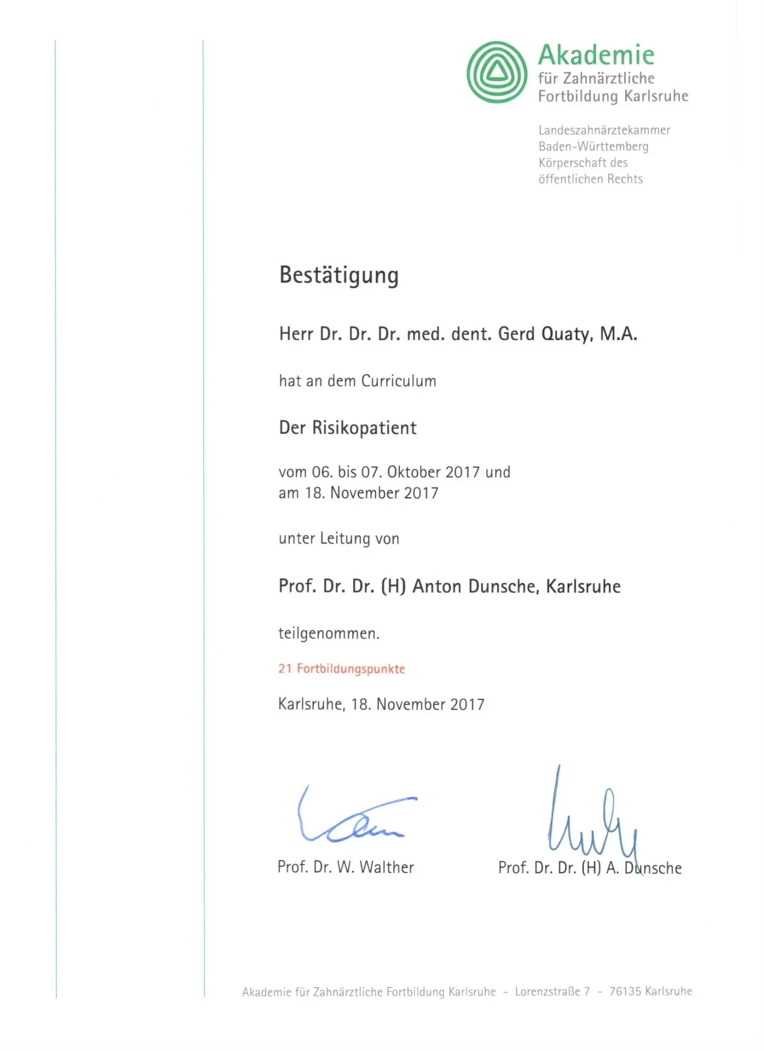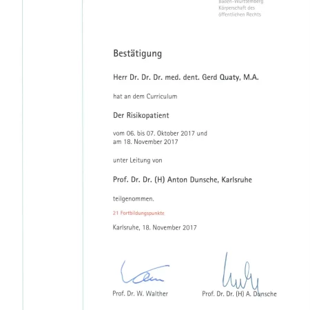 Vorerkrankungen können dazu führen, dass Patienten zu Risikopatienten werden.  In unserer Praxis achten die Zahnärzte deshalb als “Ärzte” vom ersten Besuch an darauf, welche Erkrankungen und mögliche Risiken vorliegen. Eine besondere interdisziplinäre Behandlung könnte notwendig sein bei Krankheiten wie Diabetes mellitus, Herz-Kreislauferkrankungen, Schlaganfall, Osteoporose, Angina Pectoris, Asthma, Epilepsie, Schilddrüsenerkrankungen und bei Tumorpatienten. Die steigende Morbidität (Erkrankungsrate) bedingt eine vermehrte Medikation. Dabei muss nicht jede Vorerkrankung ein Risiko bedeuten: Herzpatienten können zum Beispiel durch eine spezielle, besonders schonende Behandlung bei vielen zahnärztlichen Eingriffen weiterhin ihre blutverdünnenden Medikamente einnehmen. Priorität hat für uns ein verantwortungsvolles Risikomanagement, um Gefahren, Komplikationen und Zwischenfälle zu vermeiden.