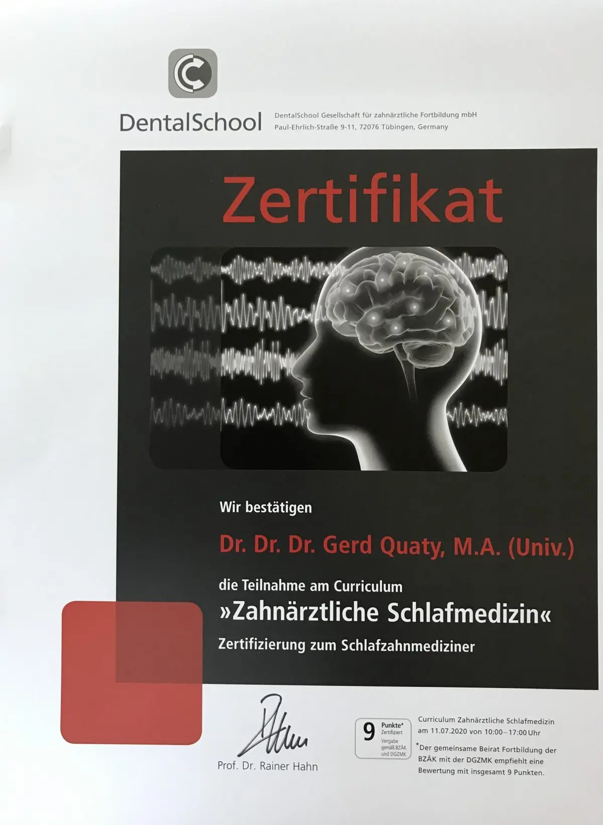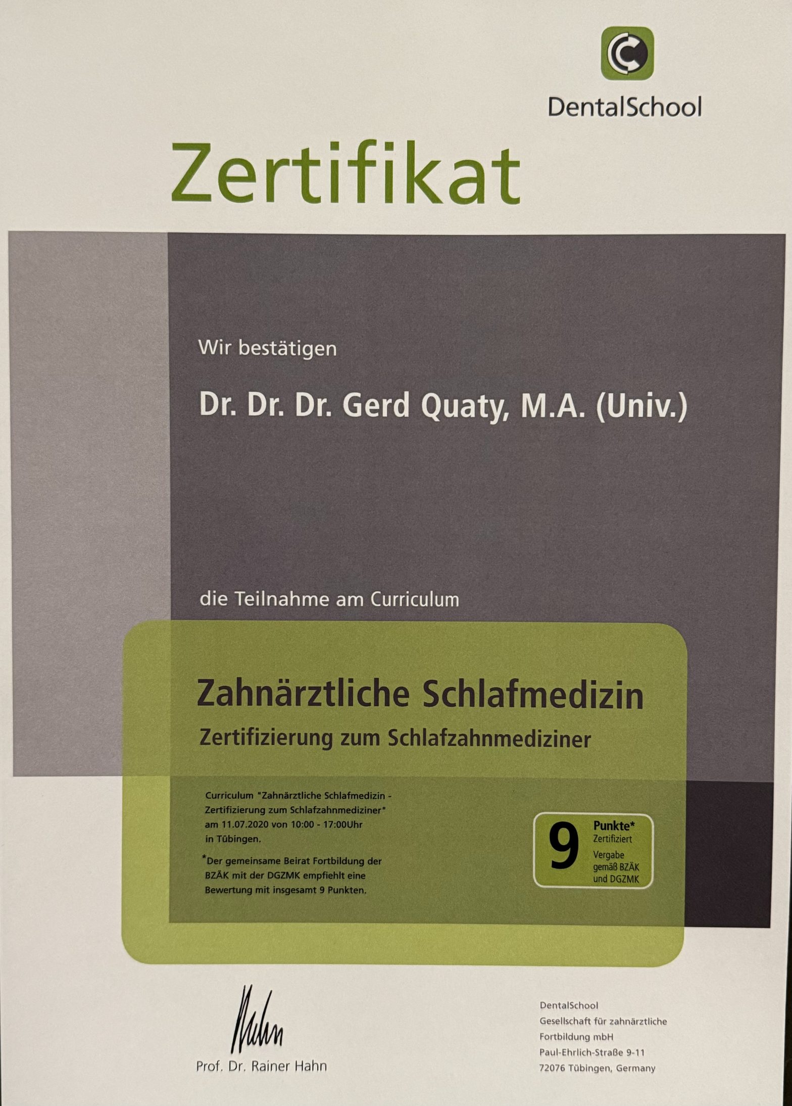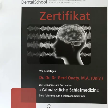 Wir freuen uns, Ihnen mitteilen zu können, dass die Zahnarztpraxis Dr. Quaty nun offiziell ein Zertifikat für „Zahnärztliche Schlafmedizin und Schnarche“ erhalten hat! Diese Anerkennung ist nicht nur eine Ehre für unser Team, sondern vor allem ein Versprechen an unsere Patienten, dass wir uns kontinuierlich bemühen, Ihnen die bestmögliche Versorgung und Behandlung anzubieten