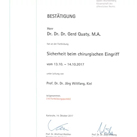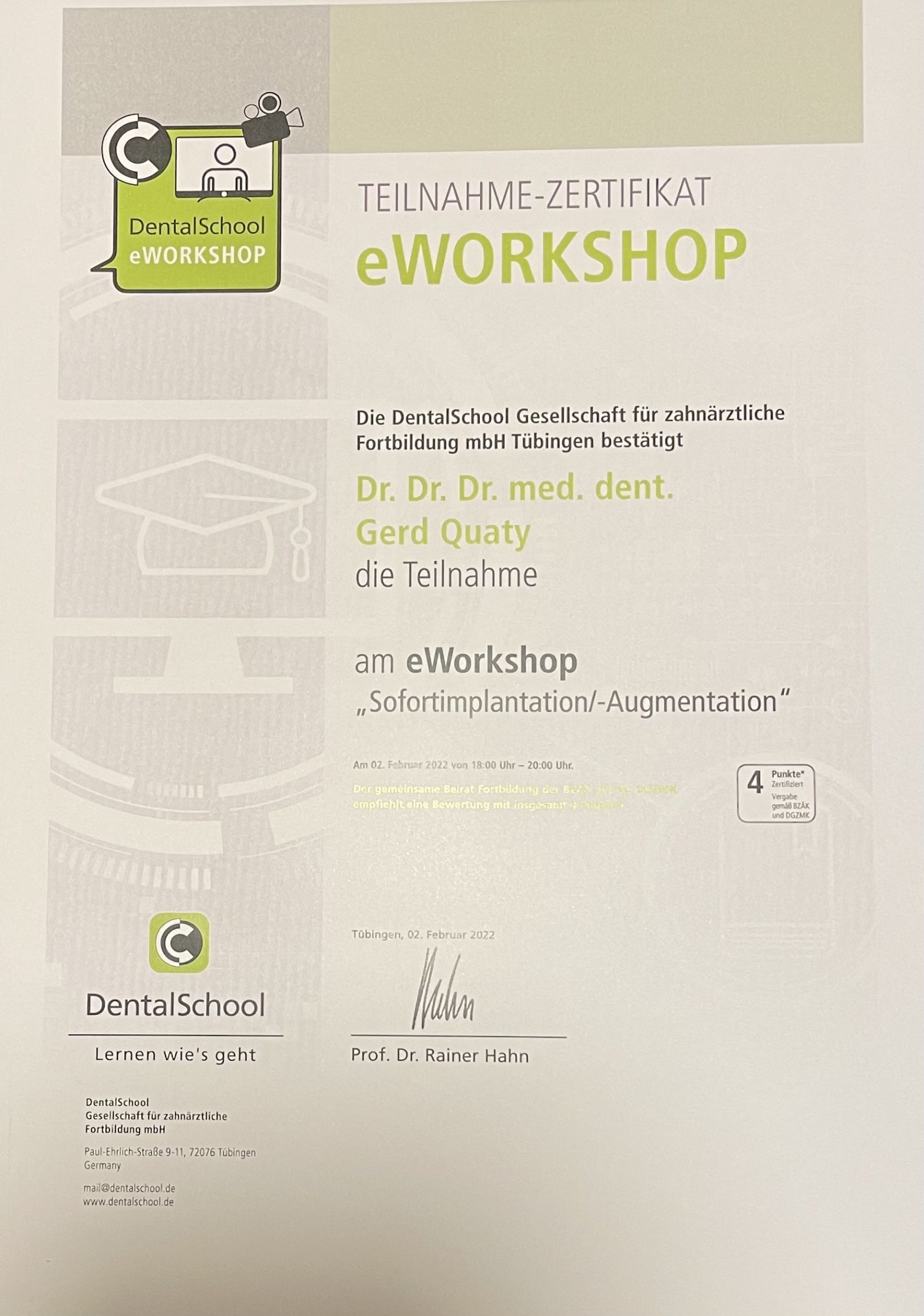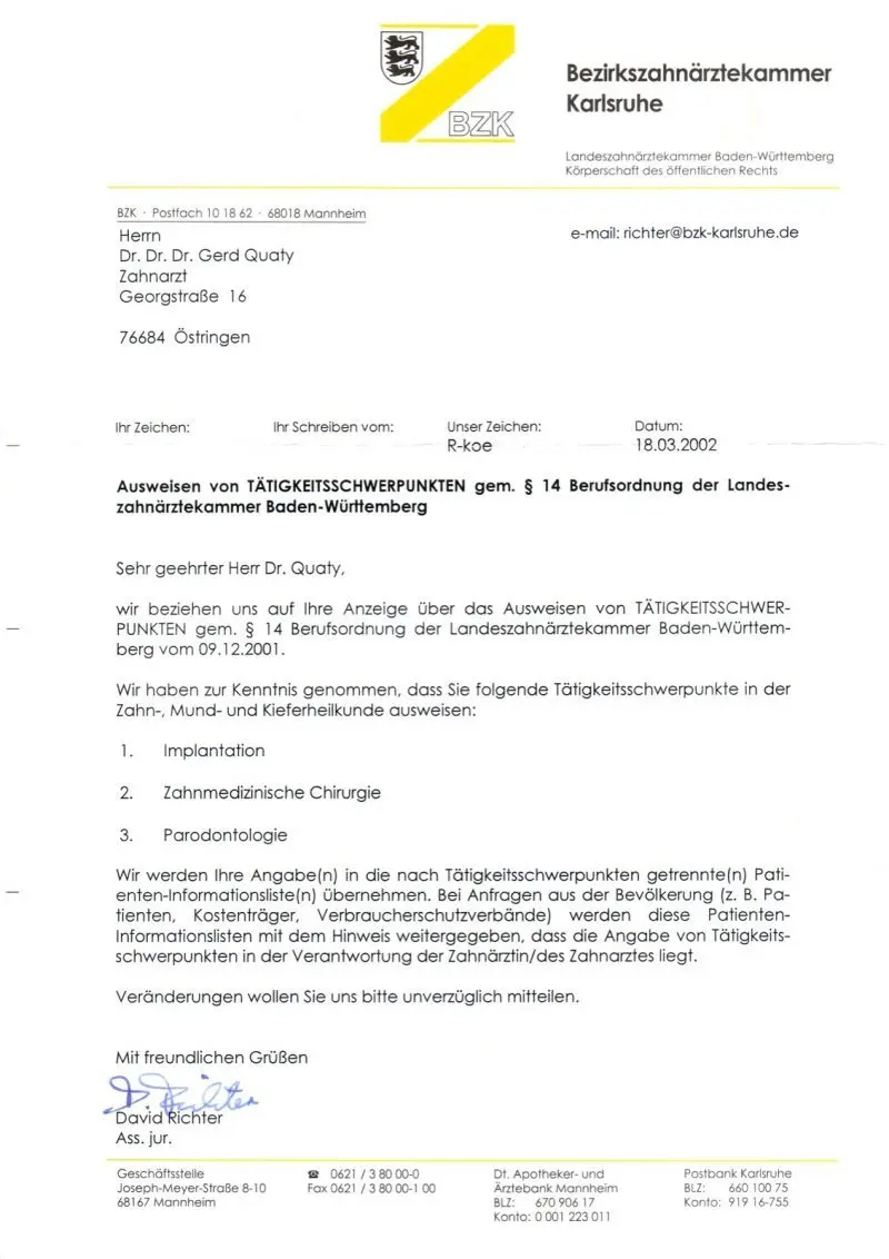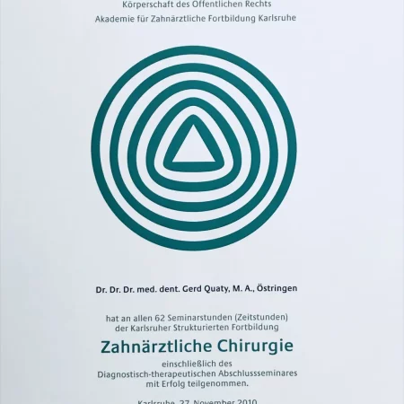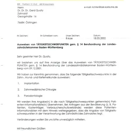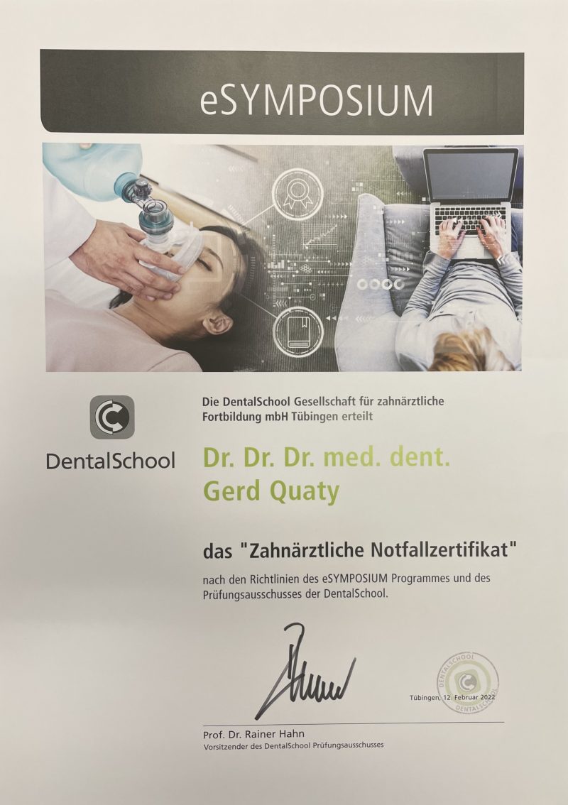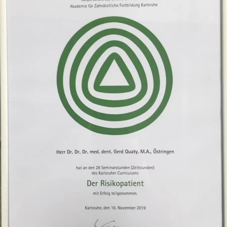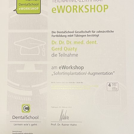 Zusätzlich habe ich die Fortbildungsprogramme “Chirurgische und implantologische Tätigkeit im Spiegel des zahnärztlichen Gutachtens“ und Aufbautrainings zur Befähigung als zahnmedizinischer Sachverständiger und zahnärztlicher Gutachter absolviert.