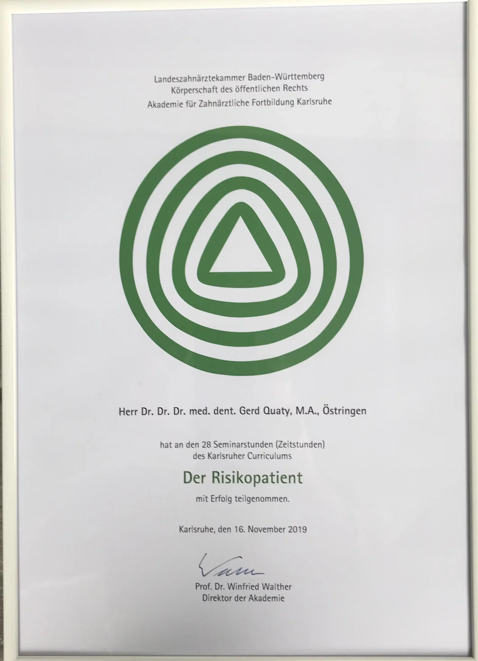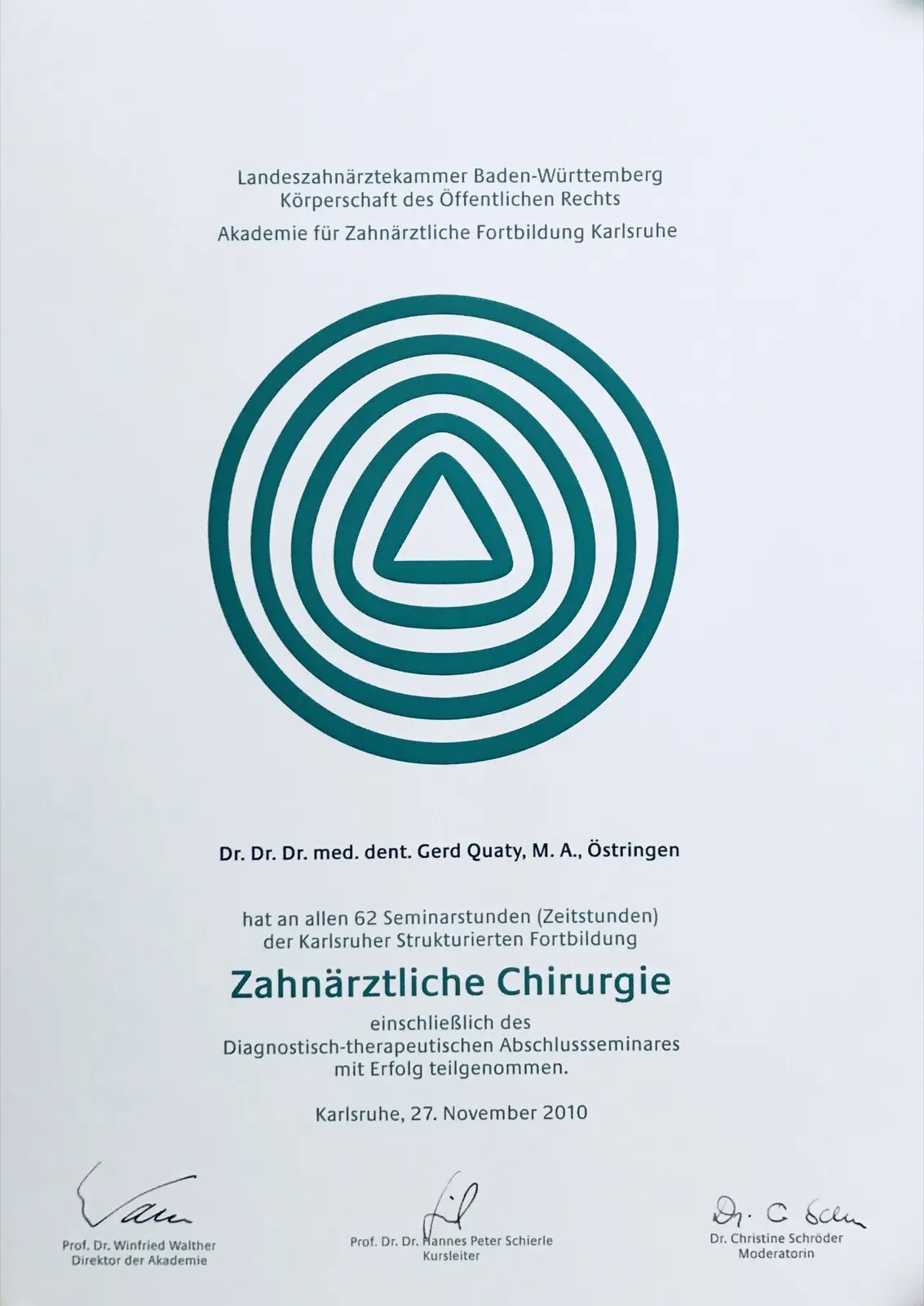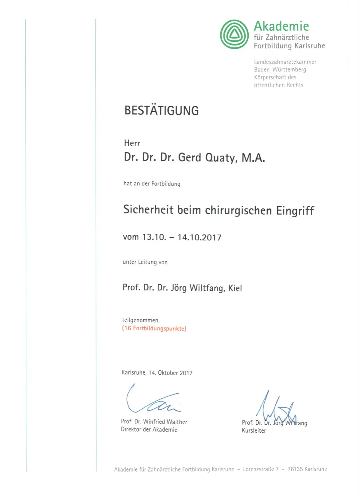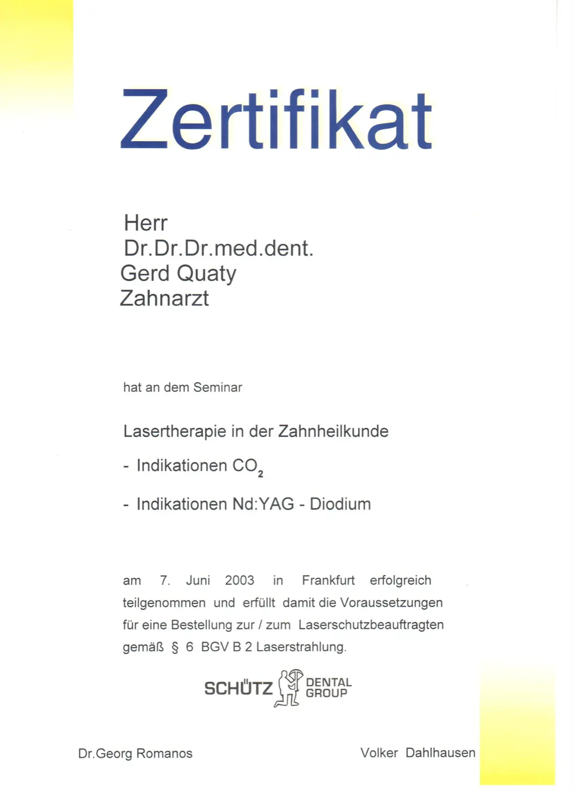 Zusätzlich habe ich die Fortbildungsprogramme “Chirurgische und implantologische Tätigkeit im Spiegel des zahnärztlichen Gutachtens“ und Aufbautrainings zur Befähigung als zahnmedizinischer Sachverständiger und zahnärztlicher Gutachter absolviert.