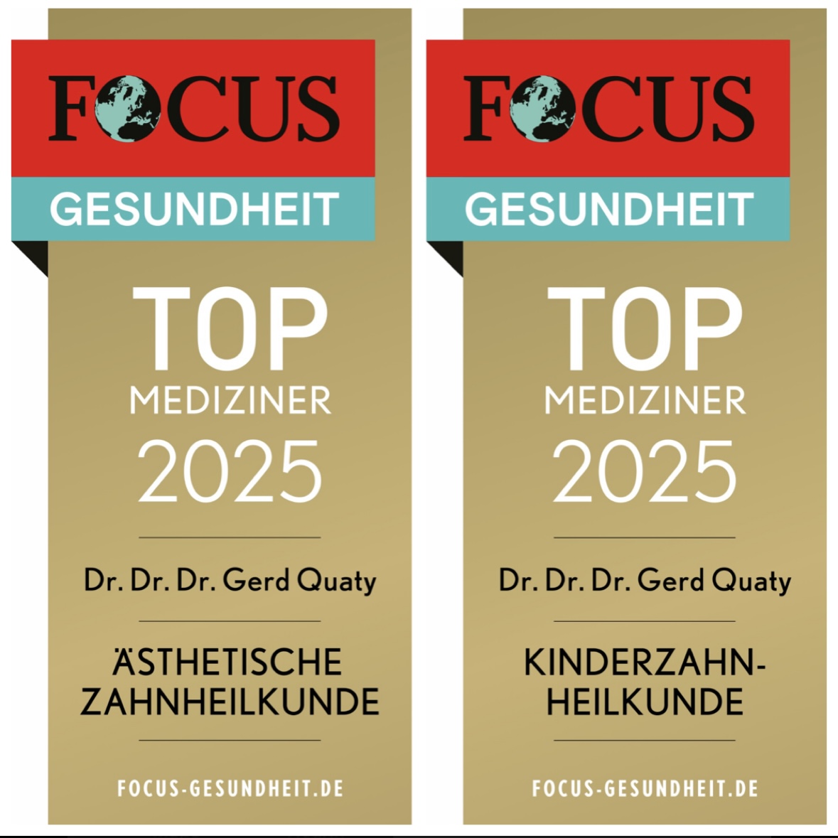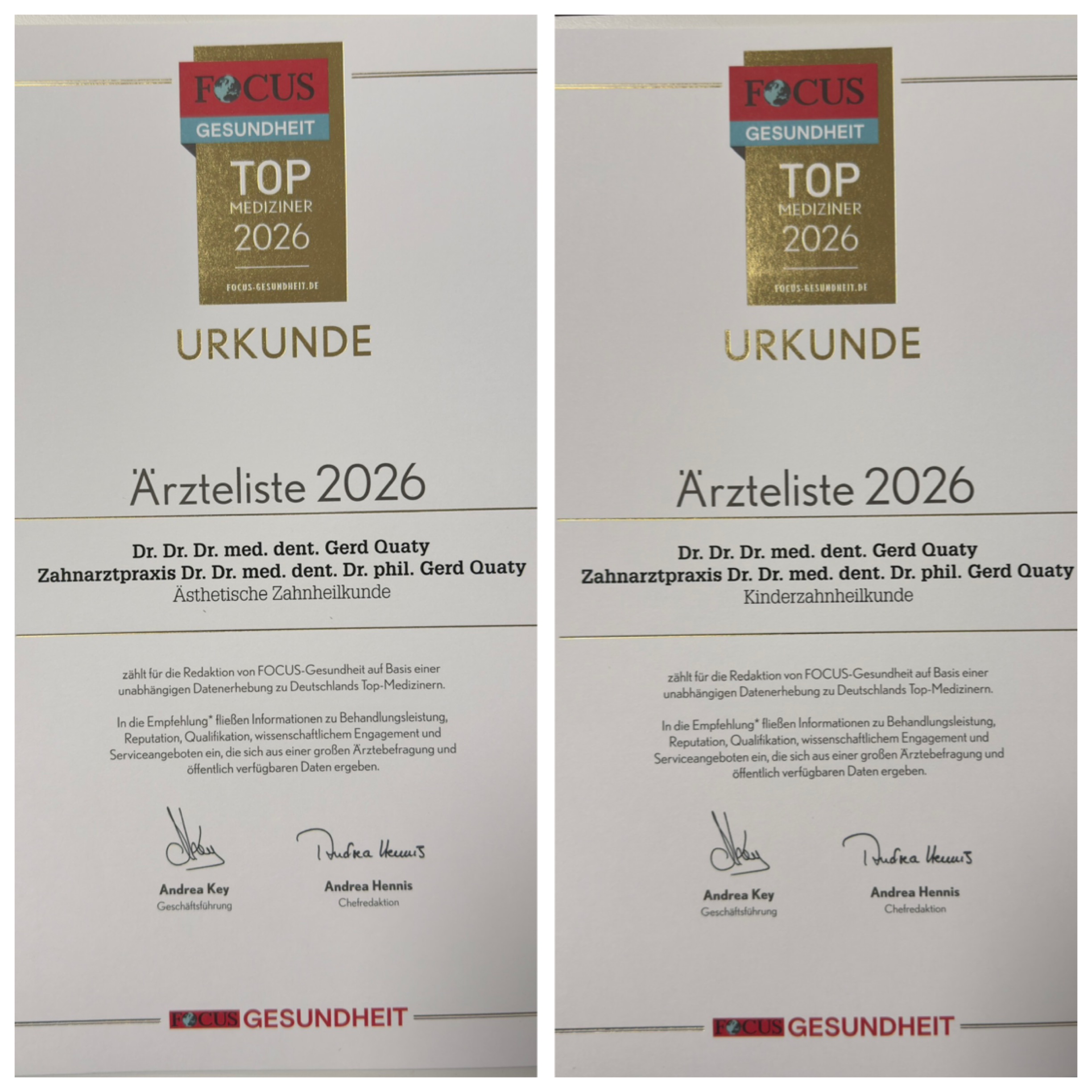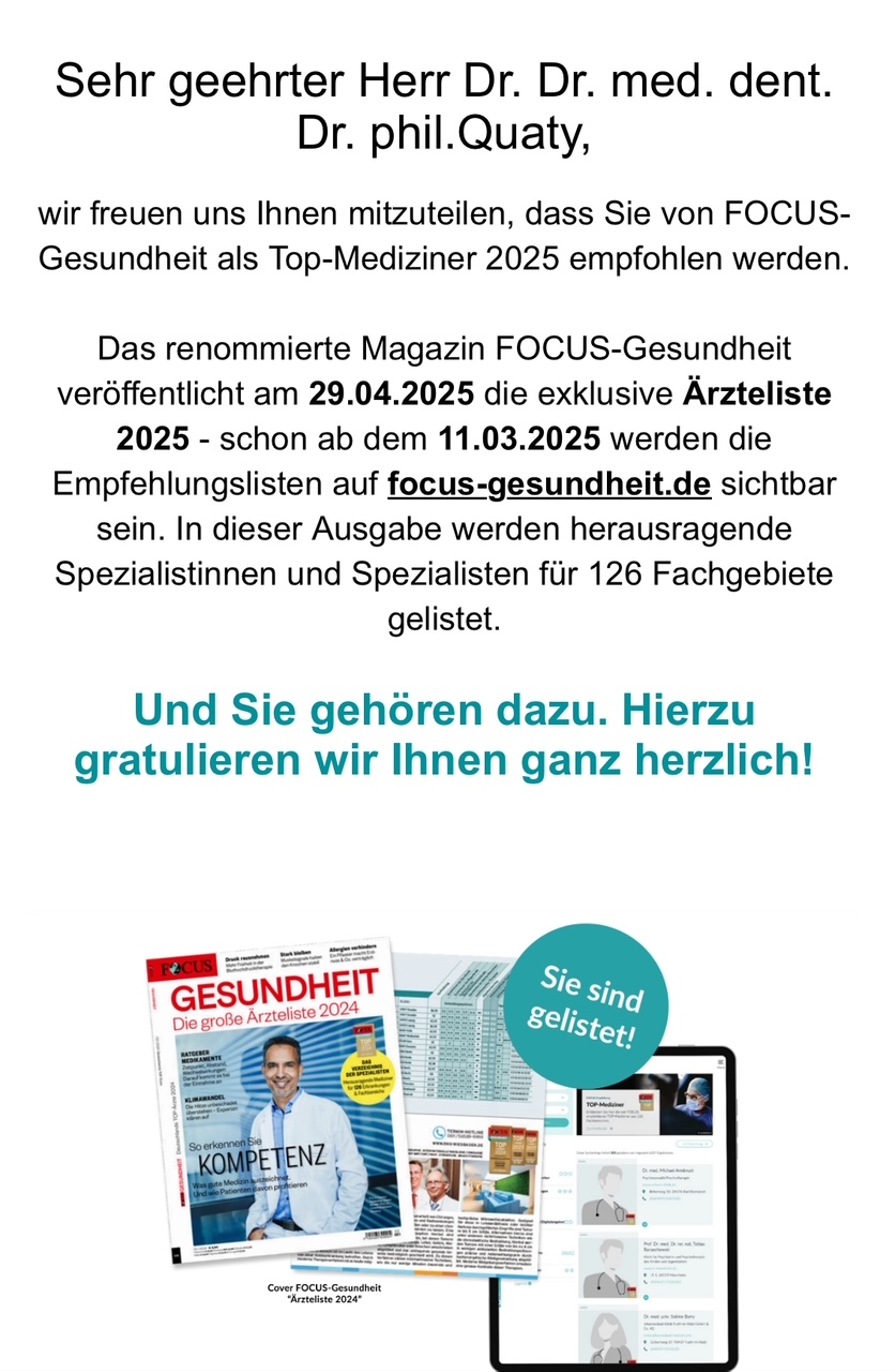 Zusätzlich werde ich aktuell wieder zweifach im renommierten Ratgebermagazin FOCUS-Gesundheit in der Ärzteliste 2025 und 2026 für herausragende Spezialisten mit Expertenwissen in den Fachbereichen „Ästhetische Zahnheilkunde“ und „Kinderzahnheilkunde“ als Deutschlands TOP Mediziner 2024, 2025 und erneut 2026 gelistet und mit Urkunden ausgezeichnet.